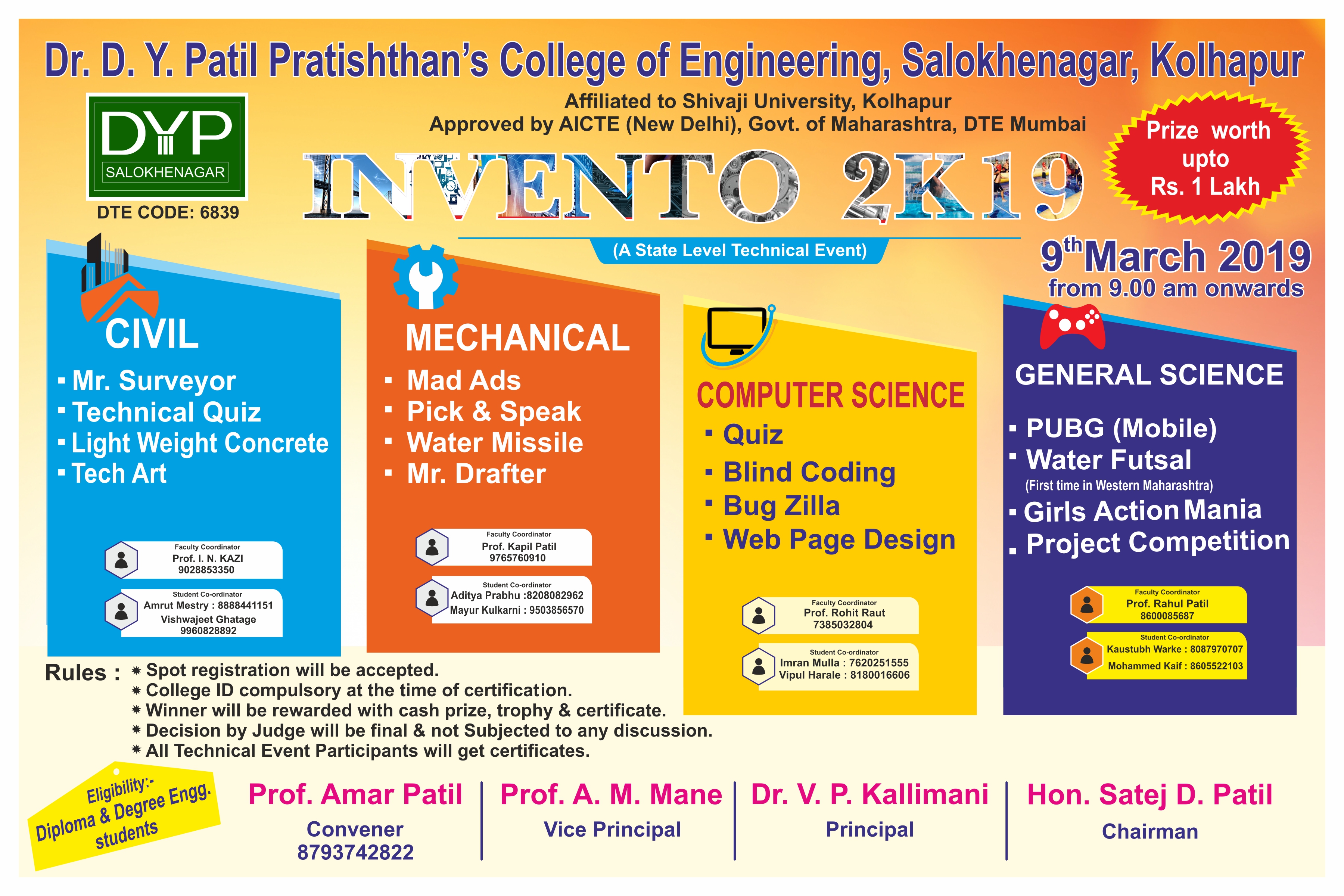 A state level event ‘Invento 2k19’ held at Dr. D. Y. Patil Pratishthan’s College of Engineering, Salokhenagar, Kolhapur. Chief guest Dr. Narake, Principal Dr. V. P. Kallimani, Vice-Principal Prof. A. M. Mane, Convener Prof. A. D. PatilĀ was present for inauguration function. Near about 1400 students were participated in different events. Students participated in following events of ‘Invento 2k19’.
